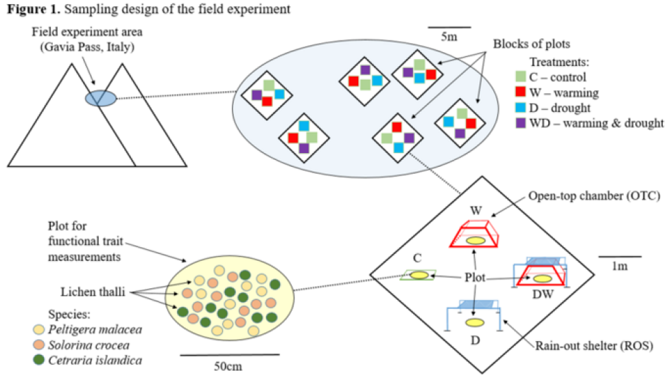 Nell’ambito del progetto saranno condotti esperimenti di manipolazione climatica in situ e rilievi di vegetazione lungo gradienti ambientali naturali, con l’obiettivo di: 1) Determinare le risposte di diverse specie di licheni a precipitazioni ridotte e/o temperature più elevate; 2) Testare nuove tecniche per misurare parametri ecofisiologici legati alla capacità di acclimatazione dei licheni; 3) Indagare le variazioni della diversità e della co-occorrenza delle specie lungo gradienti naturali di precipitazione e temperatura; e 4) Sviluppare modelli predittivi sui possibili spostamenti altitudinali delle specie degli ambienti alpini, includendo le informazioni sulle capacità di acclimatazione delle specie.